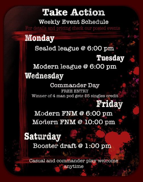 Tomorrow night is FNM at Take Action and we’re excited to see everyone out. This week instead of our normal double Modern we’ll be doing a no-ban list modern @ 6:00 p.m. that will make a cut to top 8 instead of a flat three rounds so it will run a bit longer so we’ll