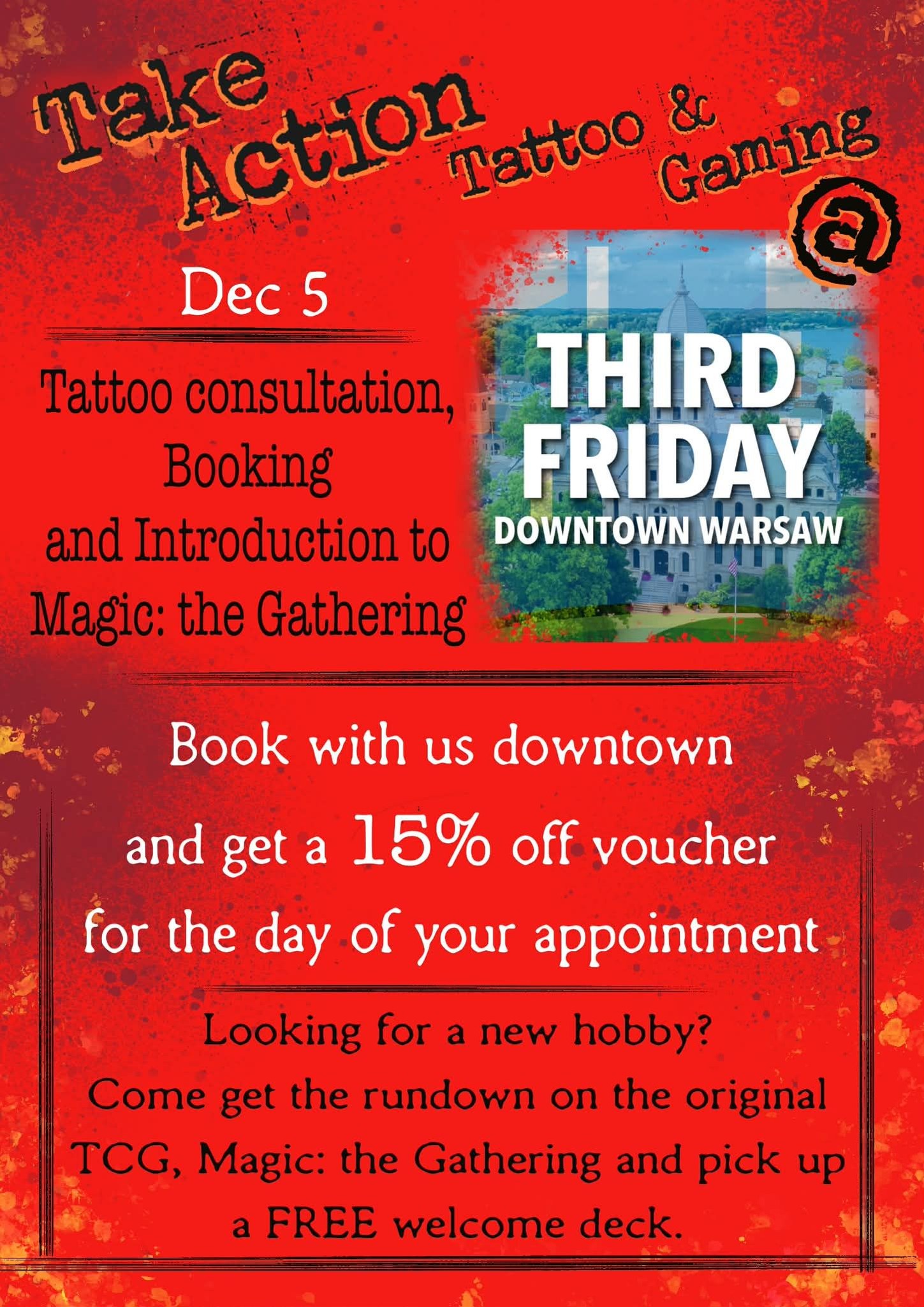 We’ll be downtown this Friday for Warsaw’s Third (in this case back to First) Friday. John and the gang will be hanging out during the downtown event doing the usual booking special and intro to MTG.