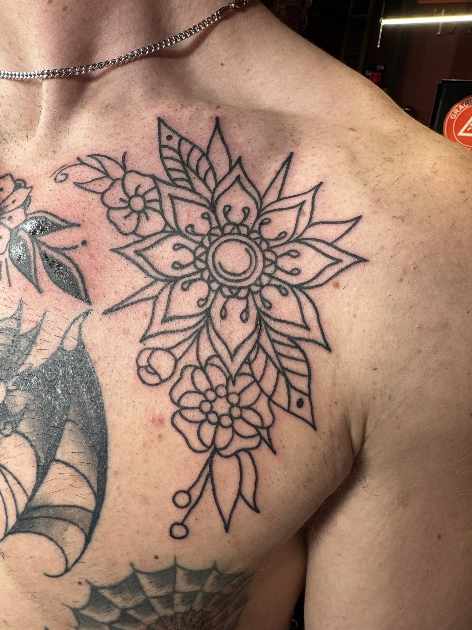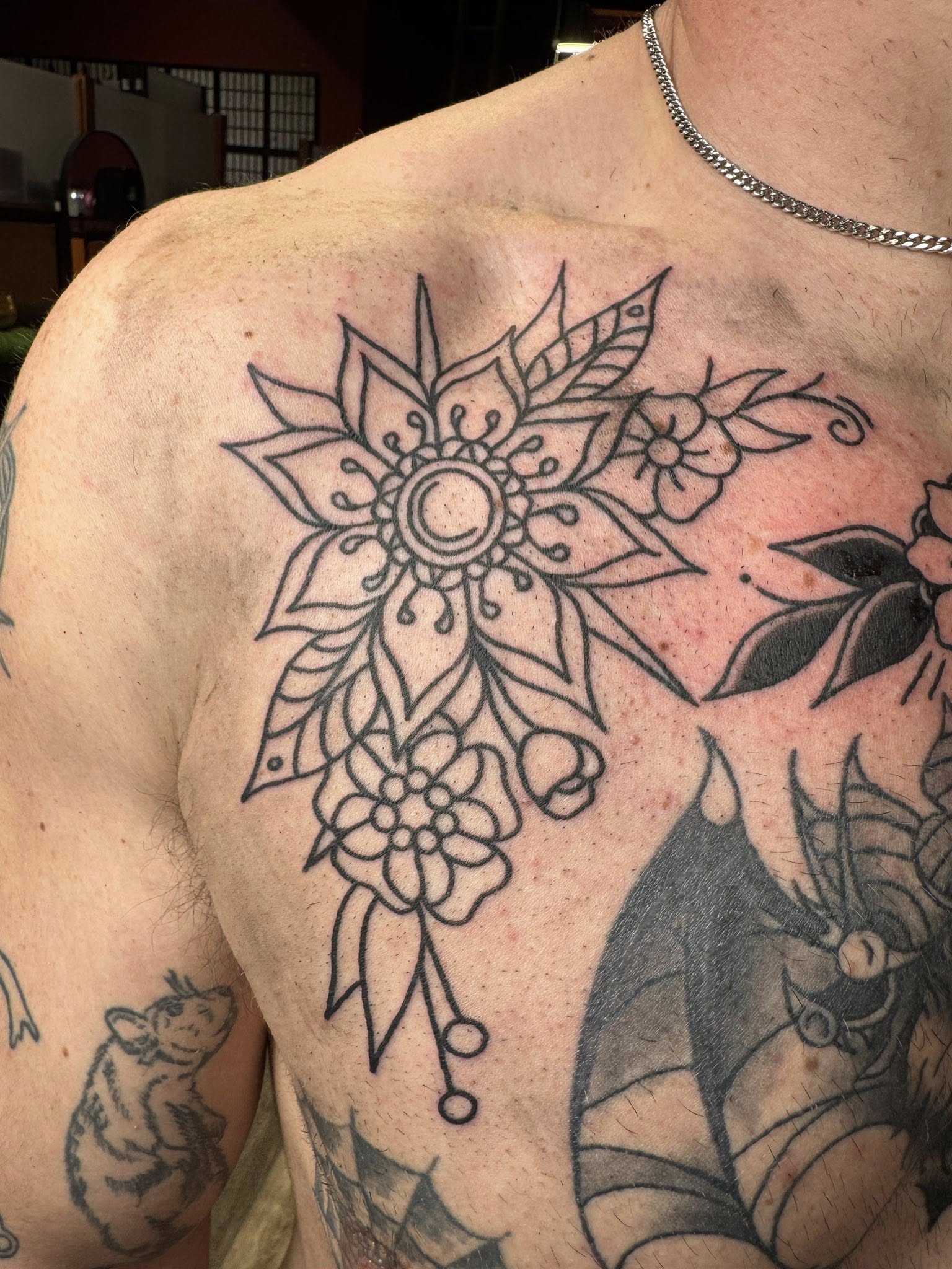 Adding some flowers and foliage to Mccoy’s chest, plus the bat all healed up. Excited to see this project all finished up, and grateful to have clients with such cool ideas!! Looking to fill up my April schedule, plenty of open slots so if you have an idea youre dying to bring to life, dont be a stranger! Stop by take action to talk or shoot me a message and lets figure something out 🦄